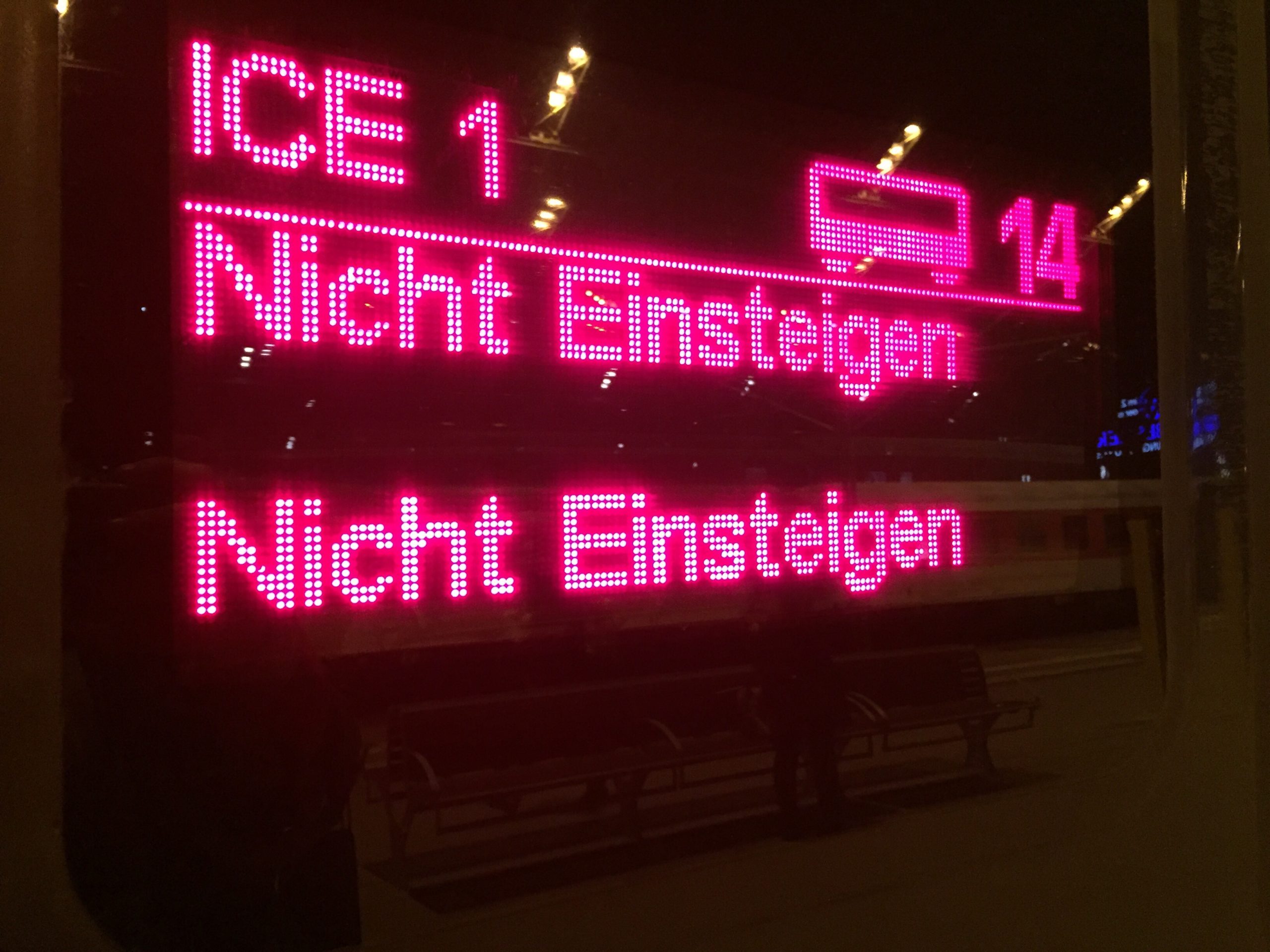 Und das neue Jahr fängt gut an. S-Bahn 5 Minuten Verspätung: Kleinigkeit. So kalt ist es 04:49 ja nicht. Dieses ICE-Manöver hatte ich so aber auch noch nicht: ich freue mich, dass der Zug pünktlich und geheizt bereit steht. Doch kaum sitze ich, die Lautsprecheransage: „Bitte steigen Sie wieder aus, dieser Zug endet hier und es wird ein neuer Zug bereit gestellt.“ Ein Glück, wir sind nicht viele Reisende hier, die jetzt ein wenig verwundert aus dem Zug ausstiegen und auf nähere Details wie z.B. Zeiten für einen Ersatzzug warten. Und das frühere Aufstehen seit der letzten Fahrplanumstellung ist auch schon verdaut. Aber kalt ist’s schon…